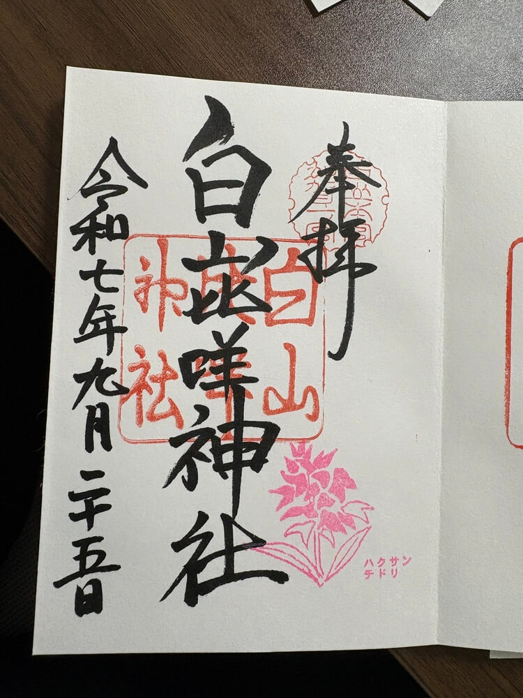特に注目すべきは、御朱印に描かれる「ハクサンチドリ」という花の印です。この花は白山の自然を象徴しており、御朱印に華やかさと美しさを添えています。御朱印を通じて、白山の自然や神聖さを感じることができるでしょう。
